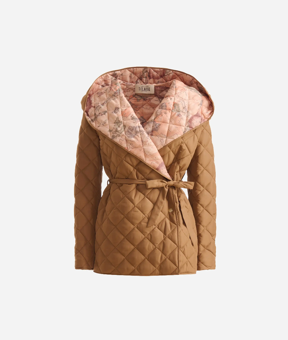 Grazioso cappottino in nylon opaco reso distintivo dall’imbottitura a losanghe e dall’interno in stampa Geo Classic, che si fa notare sia a cappuccio indossato sia abbassato. La cintura rimovibile in tono enfatizza il punto vita e impreziosisce il look con fiocchi e nodi: caldo e senza tempo, si abbinerà tanto ai look sporty quanto a quelli più raffinati.